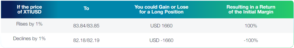 You decide to buy 2,000 barrels of XTIUSD because you think that the XTIUSD price will rise in the future. Your margin rate is 1%. This means that you need to deposit 1% of the total position value into your margin account.